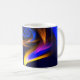 Vibrant colours abstract shape coffee mug, created as a fractal that looks like a twisted energetic vortex or swirl. It also may remind of an abstract fantasy flower with a spectacular corolla or it may inspire a cosmic rotation or unknown galaxy. The colours combination is based on shades that are not very commonly paired such as electric intense blue, orange, yellow and a smooth touch of purple.