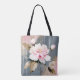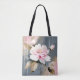 A watercolor of a light blush flower on a blue-grey and pink background with white streaks like rain creates a beautiful and romantic tote bag.