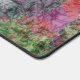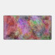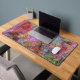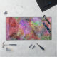 This desk mat has an abstract design with a watercolor paint look of greens, pink, yellows, and purple swirled together with grey squiggle lines.
