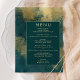 This elegant wedding menu features a modern teal blue and gold abstract watercolor background. Customise the gold-coloured text in stylish fonts on a dark teal rectangle. The back of the menu repeats the abstract design.