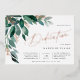 Elegant baby dedication invitation for your little girl features watercolor eucalyptus leaves and green foliage cascading from the upper left corner, embellished with rose gold foil accents. Personalise with your dedication ceremony and celebration details aligned at the right. Cards reverse to solid forest green.