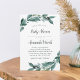 Elegant botanical baby shower invitations feature a chic colour palette of forest green, inky off-black and crisp white. Your baby shower details are draped with abundant green branches and leaves in a vibrant painted watercolor style.