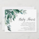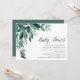 Chic baby shower invitation features lush green eucalyptus leaves illustrated in watercolor. Personalise with your baby shower details aligned at the right. Cards reverse to solid forest green.