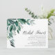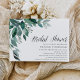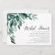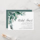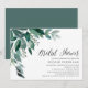 Chic bridal shower invitation features lush green eucalyptus leaves illustrated in watercolor. Personalise with your bridal shower details aligned at the right. Cards reverse to solid forest green.
