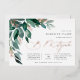 Elegant gender neutral b mitzvah invitation features watercolor eucalyptus leaves and green foliage cascading from the upper left corner, embellished with rose gold foil accents. Personalise with your temple ceremony and celebration details aligned at the right. Cards reverse to solid forest green.