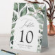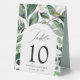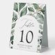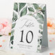 Elegant botanical wedding table number tent sign featuring the table number, your names, and wedding date nestled in an arch frame surrounded by eucalyptus, ferns, and other rich greenery. This timeless design adds a touch of natural elegance to your reception decor, perfect for garden, rustic, or botanical-themed weddings. Personalise the number for each table tent sign and add it to your cart to complete your sophisticated table settings.