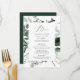 Elegant wedding menu featuring "Menu" displayed in a modern calligraphy script and menu details framed by eucalyptus, fern, and other rich greenery on a white background. Personalise the botanical wedding menu with your names, wedding date, and dinner menu. The simple wedding menu reverses to a solid dark green background with space for photos and additional text. Designed to coordinate with our Abundant Greenery wedding collection.