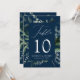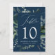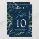 Elegant, botanical wedding table cards featuring the table number, your names, and wedding date nestled in a rectangular frame surrounded by eucalyptus, ferns, and other rich greenery with a navy background. Personalise the number for each table card and add it to your cart. The 5x7 table cards were designed to coordinate with our Abundant Greenery wedding collection.