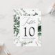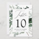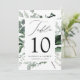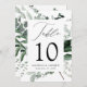 Elegant, botanical wedding table cards featuring the table number, your names, and wedding date nestled in a rectangular frame surrounded by eucalyptus, ferns, and other rich greenery. Personalise the number for each table card and add it to your cart. The 5x7 table cards were designed to coordinate with our Abundant Greenery wedding collection.