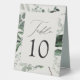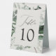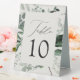 Elegant, botanical wedding table card tent signs featuring the table number nestled in a rectangular frame surrounded by eucalyptus, ferns, and other rich greenery with a cream background. Personalise the number for each table card and add it to your cart. Designed to coordinate with our Abundant Greenery wedding collection.