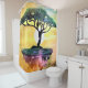 This is a very unique and fun design shower curtain. This design has a printed image of an acrylic painting of an African Acadia Tree on a floating rock. In the background is a beautiful sunset skyline.