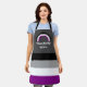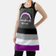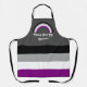 Medium-sized apron with an image of an asexuality pride flag and a rainbow; black, grey, white, and purple design on a grey background, with a customisable text template for your own name or message