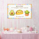 Adorable “Taco ’Bout a Baby” fiesta baby shower design featuring two cute kawaii taco, avocado and cacuts with colourful serape accents. Perfect for a fun fiesta theme baby shower.