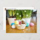 Acorn elf with Easter eggs - funny Easter postcard with decorated eggs