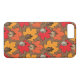Fall colour pattern in browns and oranges, maple leaves and acorns.