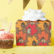 Fall colour pattern in browns and oranges, maple leaves and acorns.