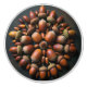 A circular arrangement of acorns is intricately laid out, showcasing a variety of sizes and shades of brown. The acorns' textures and details are highlighted against a dark background.
