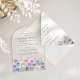Elegant watercolor asters create a floral border at the bottom of this arch-shaped acrylic birthday invitation. The soft pastel purple, pink blue and white flowers are the September birthday month flower making this the perfect theme for your September birthday.