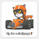 The challenge of a black and white cat, manoeuvring a fast orange racing car, with a racing helmet .