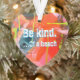 Colourful acrylic Christmas heart ornament with original artwork “Be kind. Of a beach” saying on it
