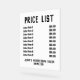 Acrylic price-list for any business such as a nail bar, beauty salon, hairdresser or barber shop. Alter prices as you wish. Displays up to 9 items and prices. Black and white.