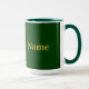 This is a green combo mug with the word Name in gold text on both sides. You can change the name by clicking the Personalise button. Then type in a new name for the mug. Funny, unique, pretty, or personal, it's your choice for the perfect coffee mug. The outside of the mug features a bright white base for your photo, logo, pattern, or saying, while the rim & handle are vividly glazed in rich colour. Match or complement the colour of your existing dinnerware set, or gift your friend a mug in his or her favourite colour.