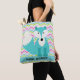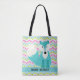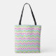 All over patterned tote bag with a background of chevron stripes of blue, pink, green, grey, and white with a bright blue and white fox and an area you can easily personalise with a name.