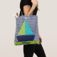 All over patterned tote bag with a background of navy blue and white chevron stripes with a navy blue sailboat with blue and green polka dotted sails. There's a green stripe where you an easily personalise with a name.