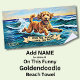 Add Name, Goldendoodle Dog Splashing in the Waves Beach Towel