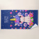 Add Name Text, Baby Unicorn Flowers & Stars Blue Beach Towel