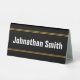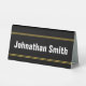 This black tabletop sign has white display text that you can edit to show a custom message such as your name. The faux gold lines that are above and below the text are not made of foil.