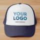 Increase your marketing by giving your customers cool swag with a trucker hat featuring your company logo and business website. Make sure your employees stand out at trade events and fairs. Replace the sample business logo and text with your own in the sidebar. Your logo can be in colour or black and white. It can be circular, square, or another shape. The custom text will be navy blue. You can also change the cap colours in the sidebar. To change the text colour, click to customise further, tap the text and choose a colour in the sidebar. Then click "done" to purchase your customised hat.