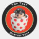 Add Your Photo and Text Custom Sticker. Personalise your sticker by uploading your own photo. Click "Customise" if the photo needs to be centred or resized in the round frame. There is an input box for curved text on the top and an input box for curved text on the bottom. The text can be changed or deleted.