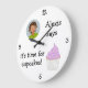 Add a photo to this cupcake themed wall clock to make a funny, personalised gift for the cake crazy person in your home or office. It's simple to add a name and the other text can also be customised to create a fun slogan of your choice. The illustration of a cupcake has pretty lilac frosting covered in balls and stars, and is shown in a white paper case.