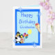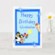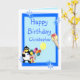 Fully customizable card with funny clown, penguin and ice cream and balloons, on a blue background. Easily personalize this design by adding or changing the text.