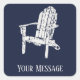 Add a name or a custom message to these stickers. The square shaped stickers feature an eggshell white Adirondack chair and matching lettering against a navy blue background.