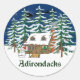 Cute log cabin surrounded by tall Adirondack Mountain pines and snow.