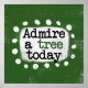 Bold text reading "Admire A Tree Today" is centred against a nature green background. The black and green text sits on a white rectangle with large textured white dots around it, providing a playful contrast against the solid colour backdrop.