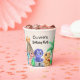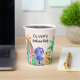 This is an adorable dinosaurs themed birthday paper cup for a little boy's birthday party. The design consists of four whimsical dinosaurs, foliage and a volcano. The paper cup can be personalised by changing the name and age on the cup.