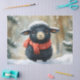 Charming illustration of a cute black lamb wearing a red scarf, surrounded by snowflakes and trees.