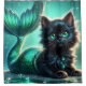 Dive into the enchanting world of this stunning artwork featuring a beautiful black kitten with striking green eyes and shimmering mermaid scales. The scales display a range of colours, including deep emerald, seafoam green, teal, and hints of blue. The backdrop is a mesmerising underwater scene with shades of turquoise and darker blue-green, filled with bubbles that enhance the magical atmosphere. Perfect for children’s decor, mermaid lovers, or kitten enthusiasts of any age, this design captures the whimsical charm of a mermaid kitten in a vibrant and captivating way.