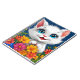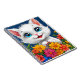 Adorable cartoon cat with fluffy white fur and large, expressive blue eyes. The cat is playfully peeking out from a vibrant bouquet of colourful flowers, including orange, pink, yellow, and blue blooms. Its small pink nose and cheerful smile add to its charm, creating a playful and inviting atmosphere. The background is a deep blue, enhancing the brightness of the flowers and the cat's features, making the overall scene feel lively and joyful.