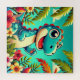Colourful illustration of a cheerful blue dinosaur in a tropical setting surrounded by leaves and flowers, evoking playful and whimsical vibes. Perfect for themes of nature, fun, and adventure.