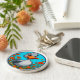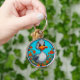 Adorable cartoon duckling with a round face, large expressive eyes, and a cheerful smile. The duckling has a light grey body with soft white fluff on its chest, and its orange beak stands out vibrantly. It stands amidst a colourful backdrop of blooming flowers in shades of orange and yellow, set against a bright blue background. The entire scene is framed with a circular border that enhances the playful and lively atmosphere of the illustration.