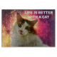 Portrait of a cute and adorable calico cat with green eyes, pink nose, and multicolor fluffy fur. The beautiful pet looks straight into your eyes. A digital painting from a photograph. Elegant and funny elegant cutting board for you. Customisable. You can change the image. You can use the image of your own cat instead of the template image if you wish. You can also change or delete the template text LIFE IS BETTER WITH A CAT. You can transfer this design to a variety of other products of your choice. Please, use the "Edit Design" or the "Personalise" (as the case may be) button to adjust the picture to the shape of the particular product. It will transfer you to the Designer Tool. Use the "Fit/Fill" option (right-side menu of the Designer Tool). You can scale, rotate, flip the image on the product template, and you can add some text of your own to it. You can also change the type, size, colour, and location of the font. Just be creative, buy one, have fun, and be happy!