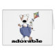 An adorable white and brown spotted dog with a chubby belly wearing denim overalls flies a kite and black text reads "Adorable".