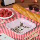 Cute little Easter Bunny with a happy grin, wearing a pretty pink Spring dress and pink bow in her hair. She is holding a basket of coloured Easter eggs and lovely pastel flowers. Background colour and font style can be changed. There are paper cups and napkins also available.