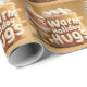 A charming and sweet 3D render or miniature photograph featuring an adorable, fluffy beige felt gnome standing next to a large, textured fabric mug. The gnome has a large white beard, pink cheeks, and a beige knitted hat. The oversized mug is labeled with the message "Warm Holiday Hugs" in white, marshmallow-like letters, and is overflowing with soft white marshmallows. The scene is set against a warm, soft ochre background, emphasizing the cozy, comforting, and whimsical nature of the image.
