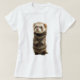 A charming and highly detailed digital illustration of a cute ferret standing upright, dressed in a cozy, oversized brown knitted sweater. The ferret features expressive dark eyes, soft cream and brown fur, and delicate whiskers. The textured knit of the sweater adds a warm, handcrafted feel to the artwork, while the clean, neutral background ensures all focus remains on the endearing character. The soft lighting emphasizes the fluffy texture of the fur and the intricate wool patterns, creating a whimsical and heartwarming aesthetic.