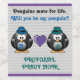 Two adorable penguins with violet heart and light grey stripes. The one on the left is wearing a blue fedora, while the one on the right wears a turquoise boater hat. Replace the sample text with your own words for a unique gift. Makes a wonderful gift for a gay couple, gender neutral, gender fluid or gay wedding ceremony, proposal, engagement, anniversary, as well as baby birth or adoption.